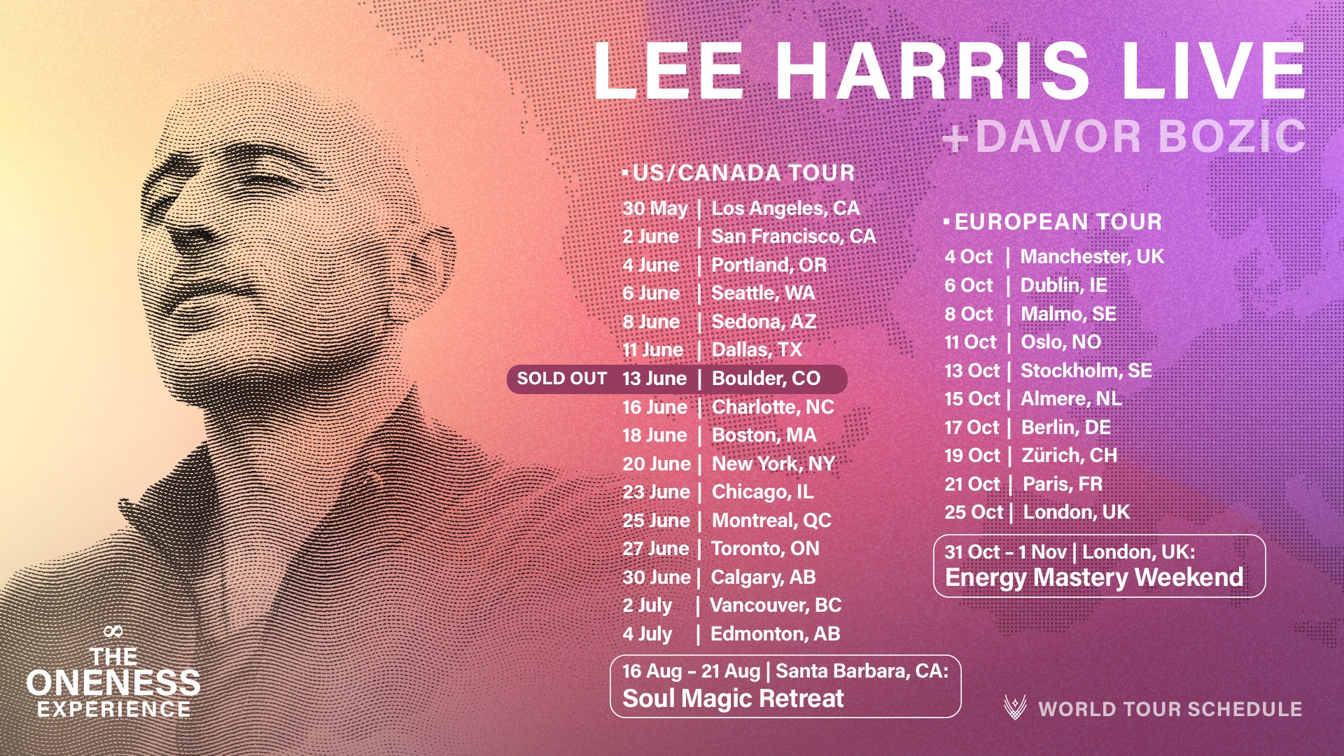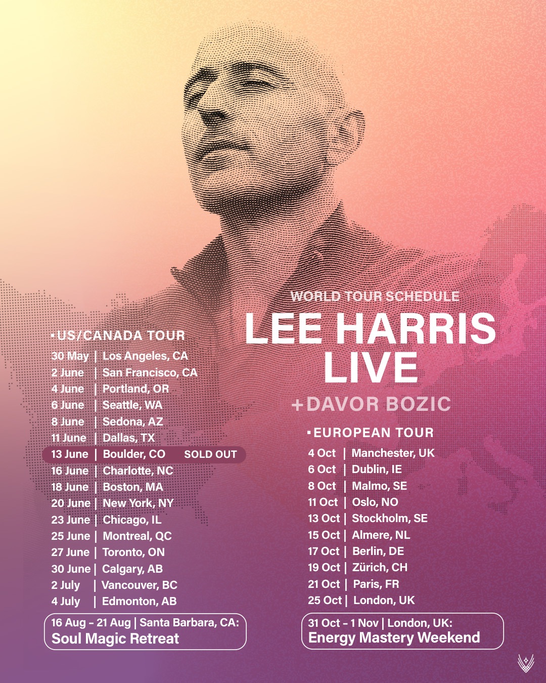 Lee’s WORKSHOPS—held in person across the globe—are powerful explorations into living, loving, and awakening. His sold-out Big Love live tours, alongside composer Davor Bozic, blend channeling, humor, and music into transformative experiences of self-discovery, insight, and practical guidance for facing life’s everyday challenges.